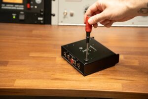 To mount the TRP2, TRP3, or 1029, take the top plate off each unit and place the rack tray on top of the unit(s) you’re mounting, lining up the holes. Use the same screws from the top plate (or the supplied screws; they’re the same) to affix the rack tray to the unit(s). The screws used for this are 4-40 1/4″ Phillips Flathead Undercut screws.