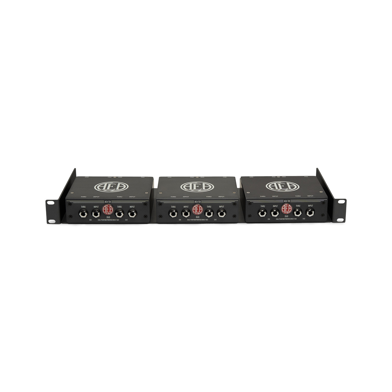 To mount the TDI Duos, flip the Duos upside-down and place the AEA rack tray on top of them. Line up the 2 holes on the bottom of each Duo with the countersunk holes on the bottom of the AEA Rack Tray. Affix the Duos to the rack tray using the supplied 8-32 1/4″ Phillips Flathead Undercut screws. Two screws are used per TDI Duo to prevent the unit from shifting.