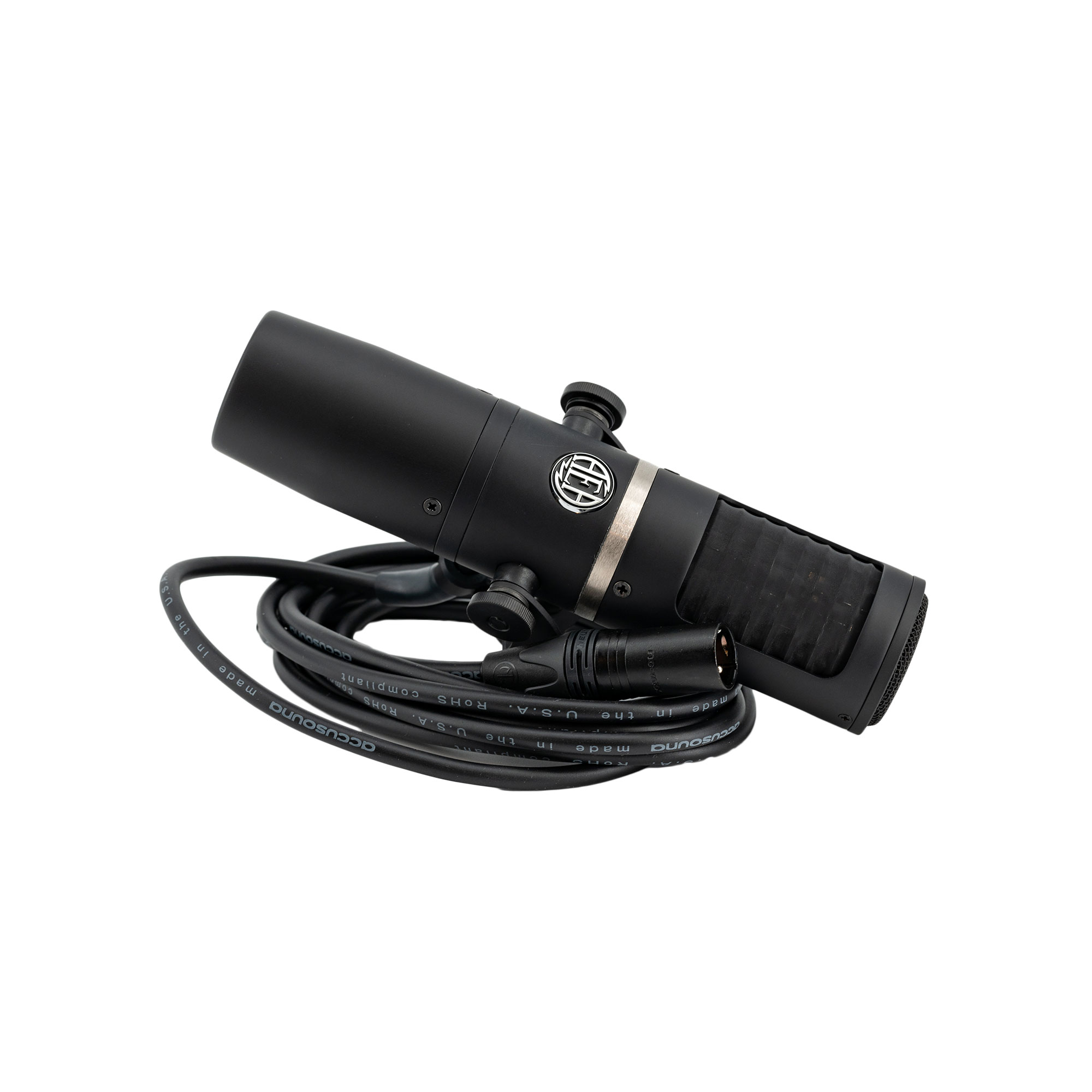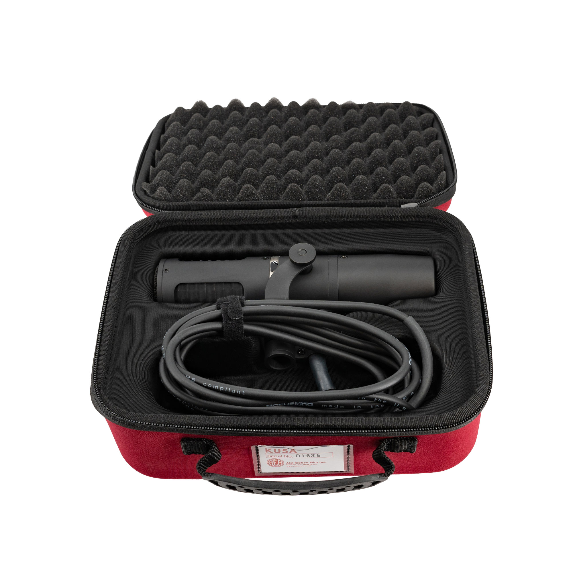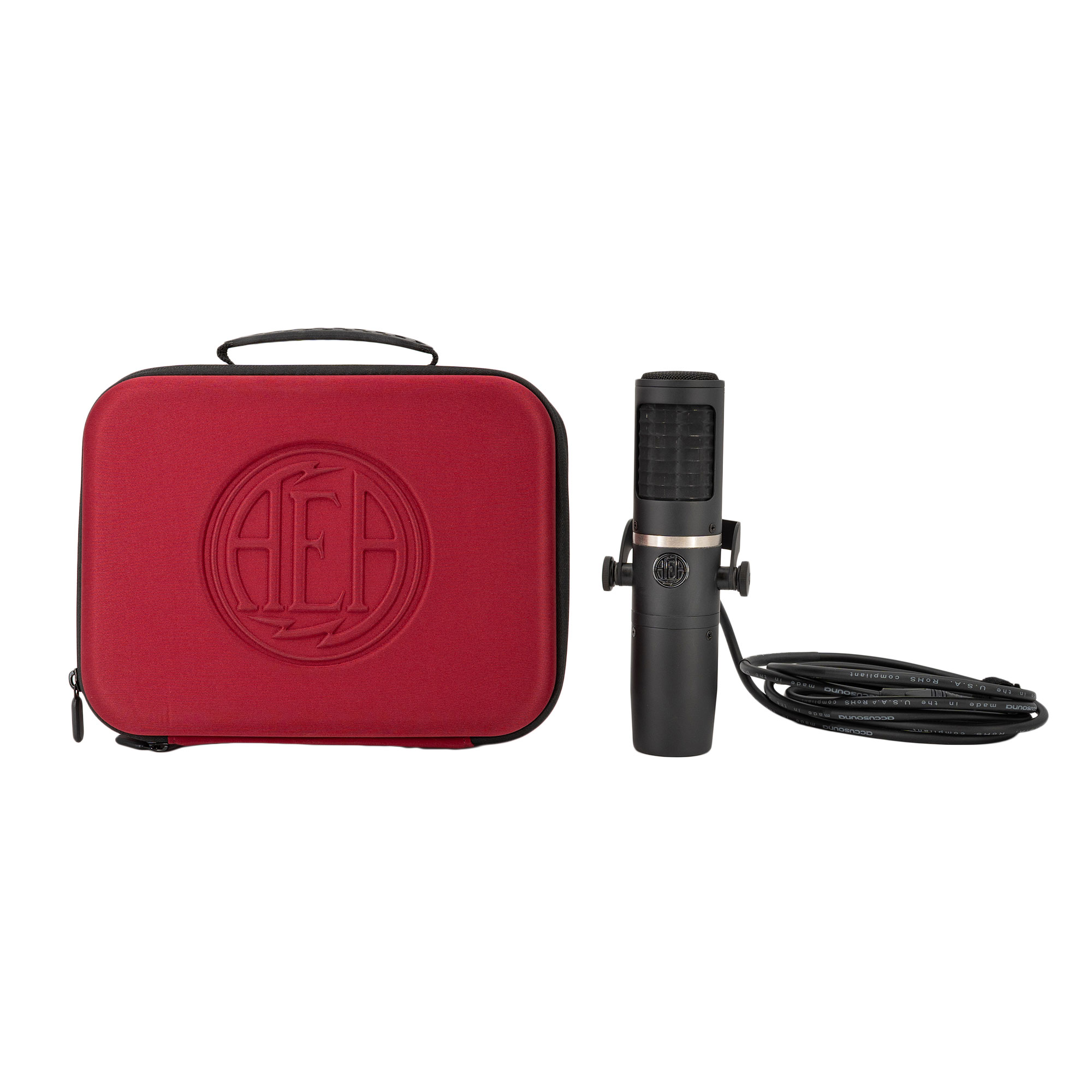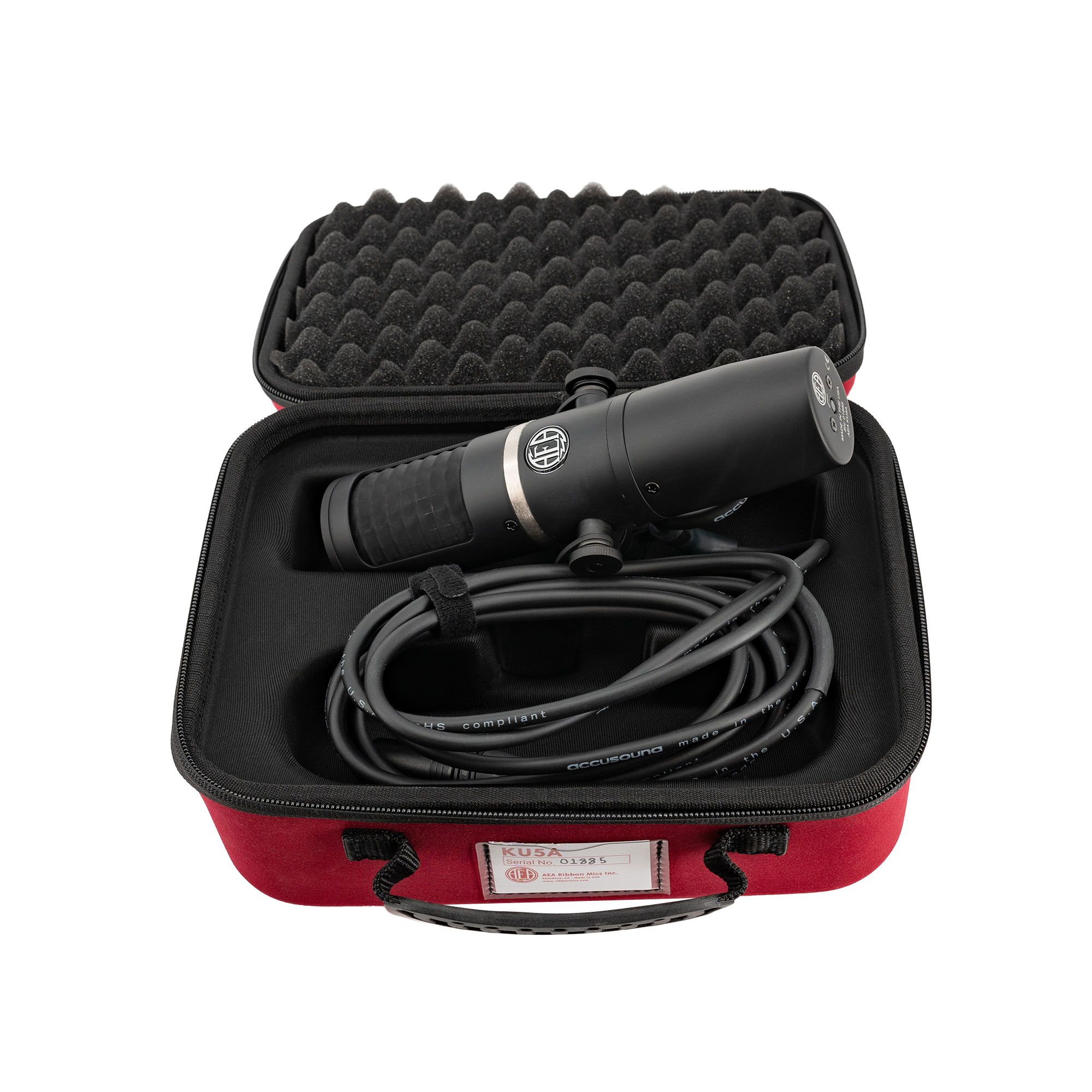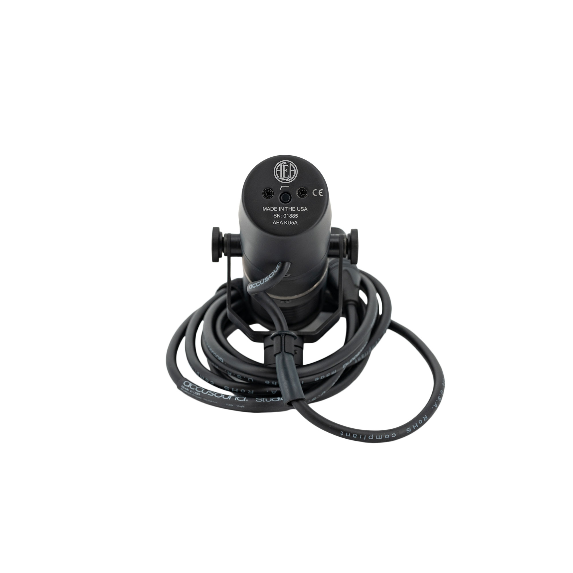With its front-address design and integrated yoke-style mount, the matte black AEA Ribbon Mics KU5A active ribbon microphone offers easy positioning along with condenser-like performance, a winning combination for close-ranging recording of vocals, acoustic instruments, and speaker cabinets. In addition to its custom transformer, which helps the KU5A achieve high output and low noise, the mic has a switchable high-pass filter, a feature seldom found on ribbon mics. Being a near-field ribbon, the KU5A provides reduced proximity effect to make it ideal for placement up close on the source. Its supercardioid polar pattern exhibits directional pickup traits and strong rejection of off-axis sound such as bleed and room reflections. The 9.8′ attached cable is terminated with a standard XLR 3-pin male connector for hookup to virtually any microphone preamp; 48V phantom power is required to power the mic’s active electronics.